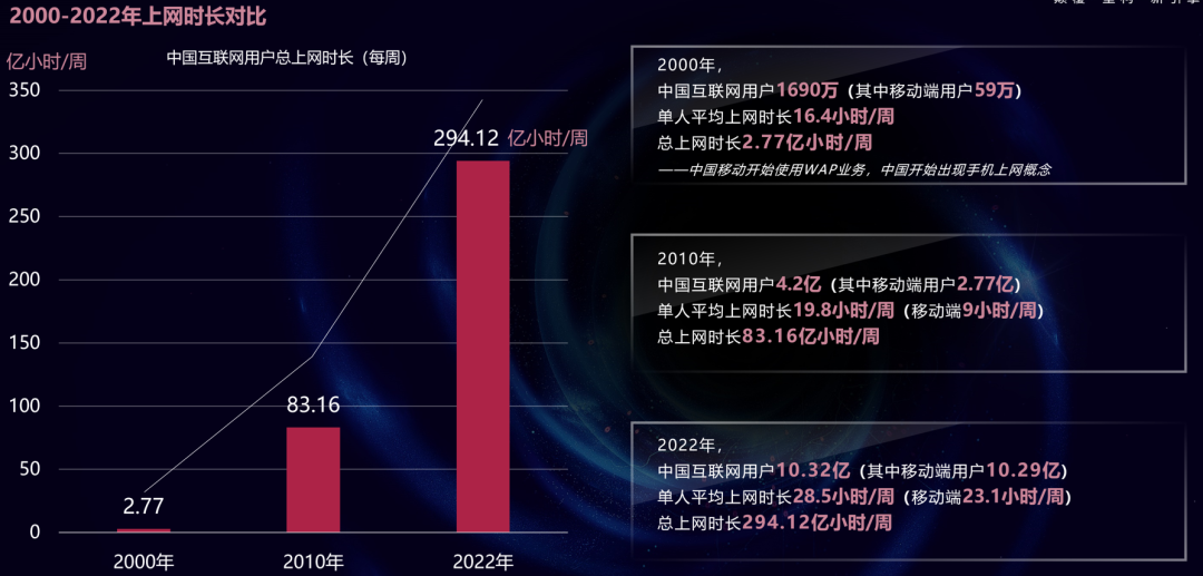 从消费侧来看,2000年我国的上网人数是1690万,平均上网时长是16小时/周,2022年我国互联网用户数已达到10.32亿,平均上网时长是28.5小时/周。每周的总上网时长从2.77亿小时增长到294亿小时,达到100多倍。数字消费已经成为消费主流,标志着一个新浪潮的到来。