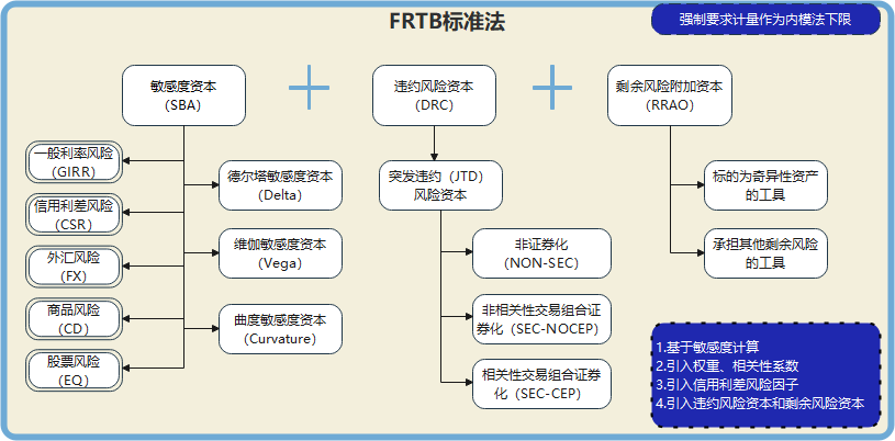 新标准法(FRTB)通过确定风险因子和敏感度指标计算资本要求,取代原基于头寸和资本系数的简单做法。